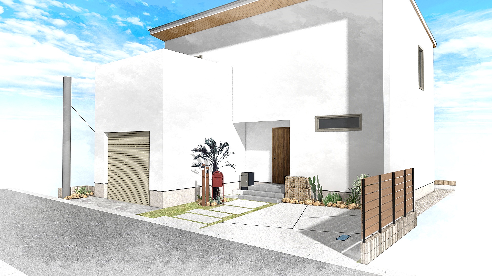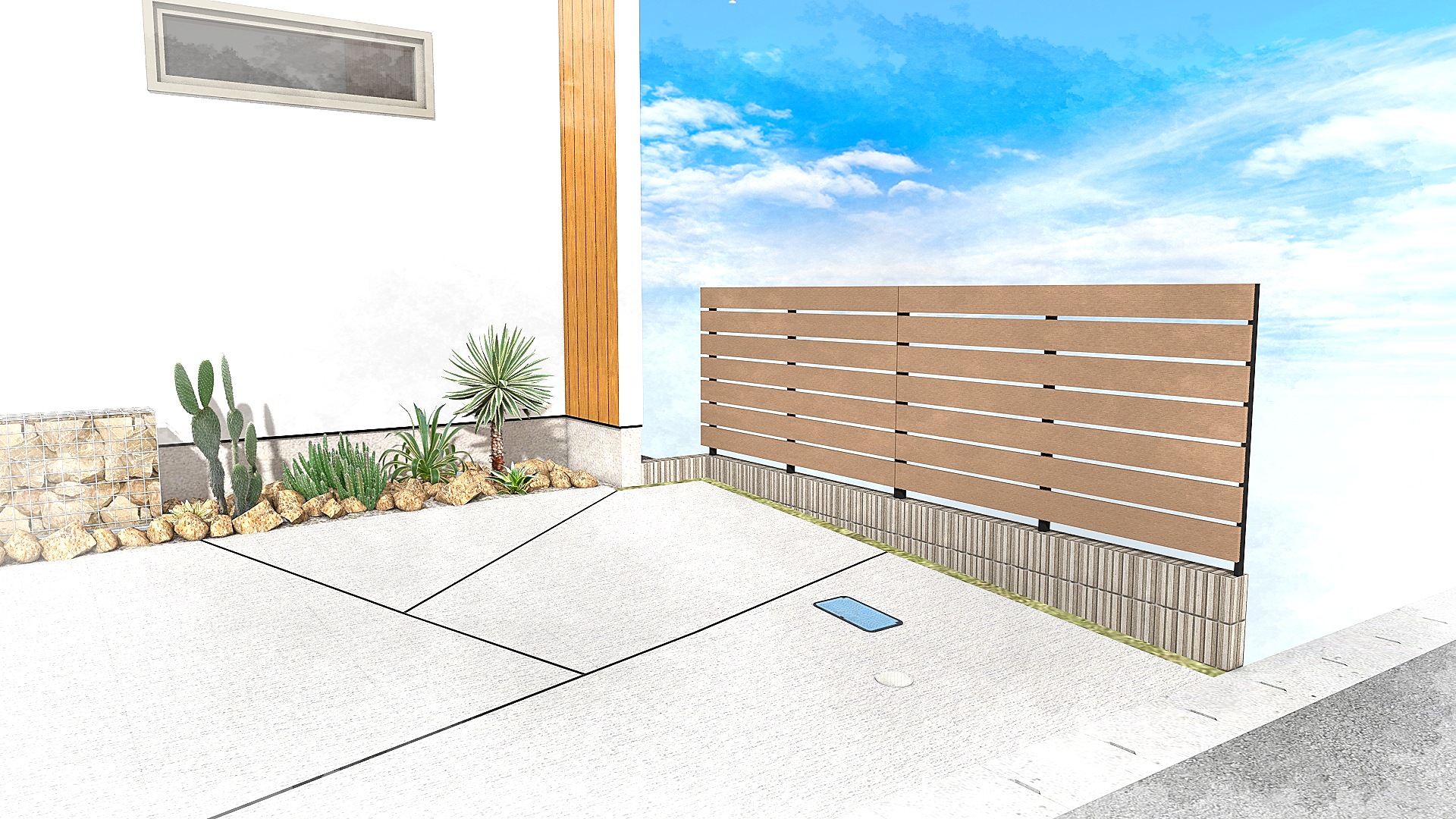 「ガレージ前のタイル」「ガビオン」「門柱」