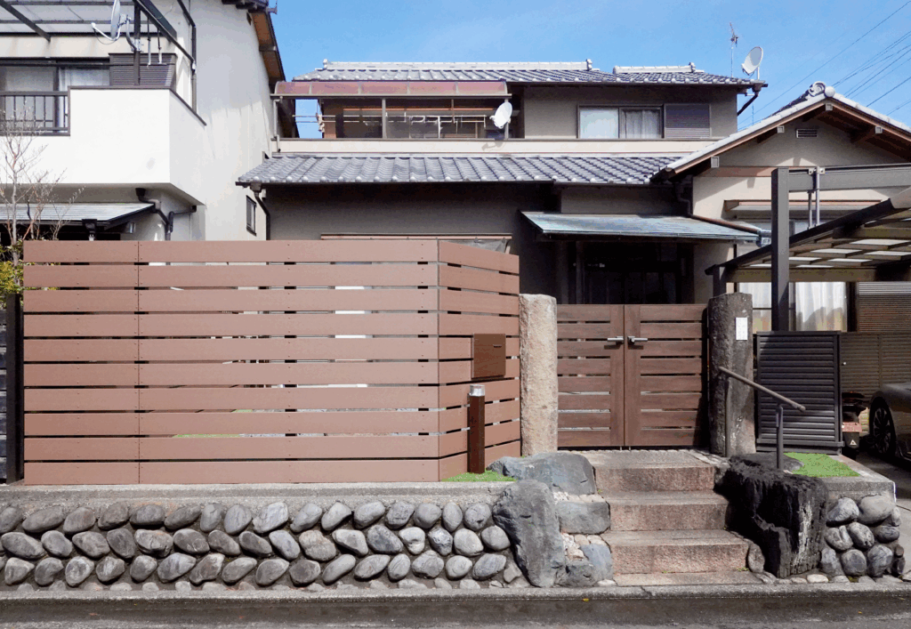 以前は生垣で囲まれていたお庭ですが、目隠しフェンスへとリニューアル。今回は「エコモックフェンス(ブラウン)」を採用し、板の隙間を狭くすることで猫の侵入防止にも配慮。デザイン性と機能性のバランスを重視しました。